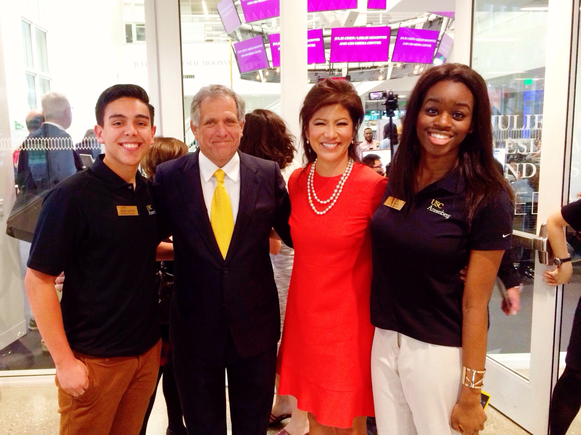 I didn’t think that I’d be writing another “Rubbing Elbows with CEOs” this soon! Today’s event brought Leslie Moonves, President and CEO of CBS and Julie Chen (Annenberg Alum, Fight On!) of CBS to our campus for a special announcement by Annenberg Dean Ernest Wilson and USC President C.L. Max Nikias. The media center in Wallis Annenberg Hall is now officially named for our honorees: Introducing the Julie Chen/Leslie Moonves and CBS Media Center!
