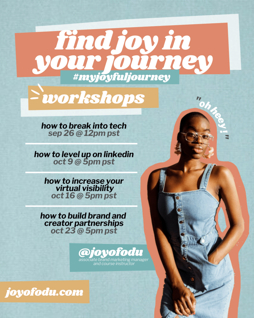 I’m announcing a NEW weekly workshop series as part of #myjoyfuljourney – the first is an informational interview with me and all my tips for breaking into tech. Seeya there!