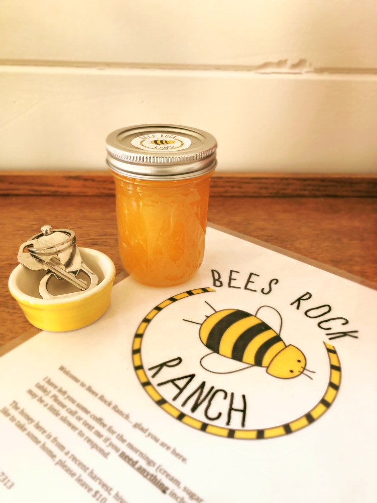 A fresh jar of honey, keys and instructions from Bees Rock Ranch