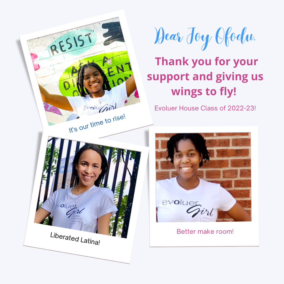 On behalf of The Evoluer House and myself, thank you for your generosity of a $500 donation to The Evoluer House. Your willingness to help underserved girls of color in our community has made all the difference for Evoluer program graduates like Sahara and Jennielee.
