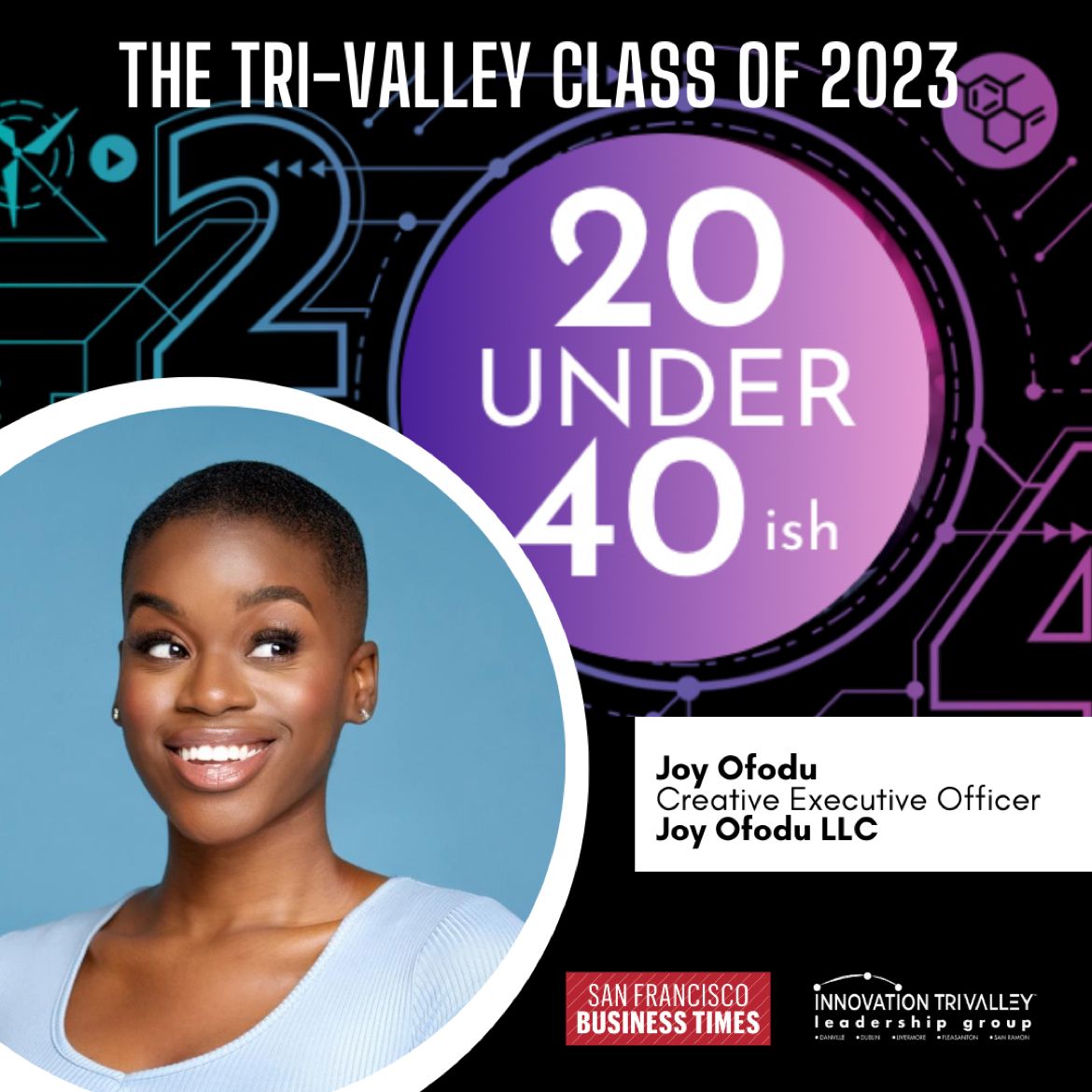 Special Guest and 20 UNDER 40ish honoree Joy Ofodu will host and introduce you to the slate of change-makers driving the Tri-Valley’s 2040 VISION plan and beyond.